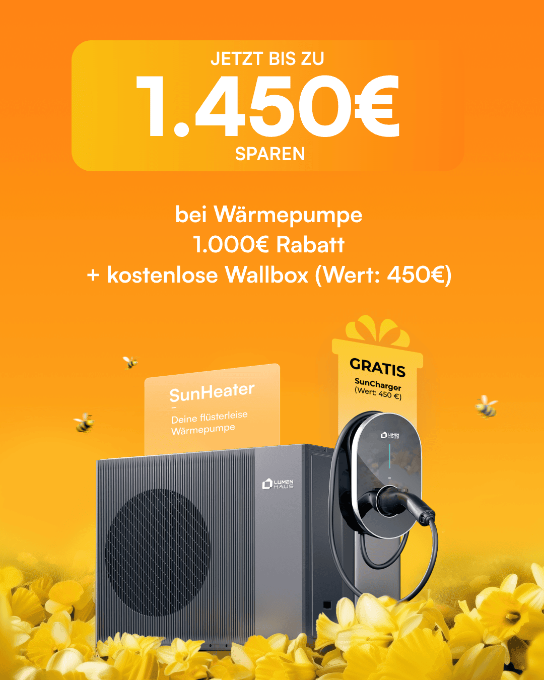 Bei Bestellung eines reines Wärmepumpensystems erhältst du eine kostenlose Wallbox sowie einen zusätzlichen Preisnachlass, was einem Gesamtvorteil von 1.450 € entspricht.