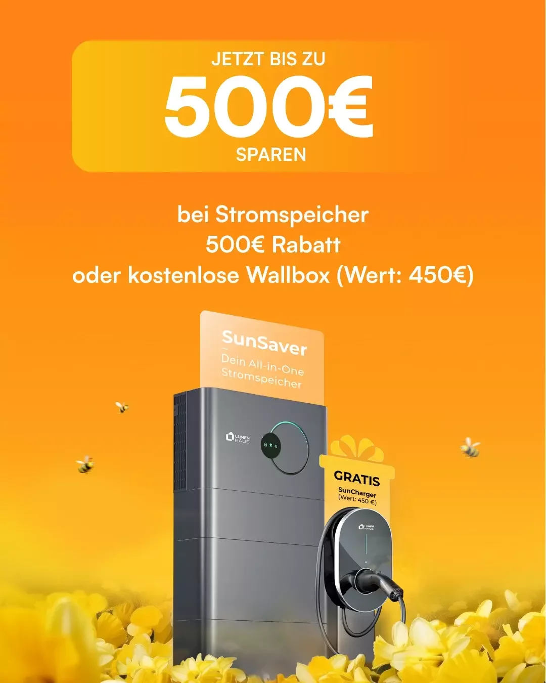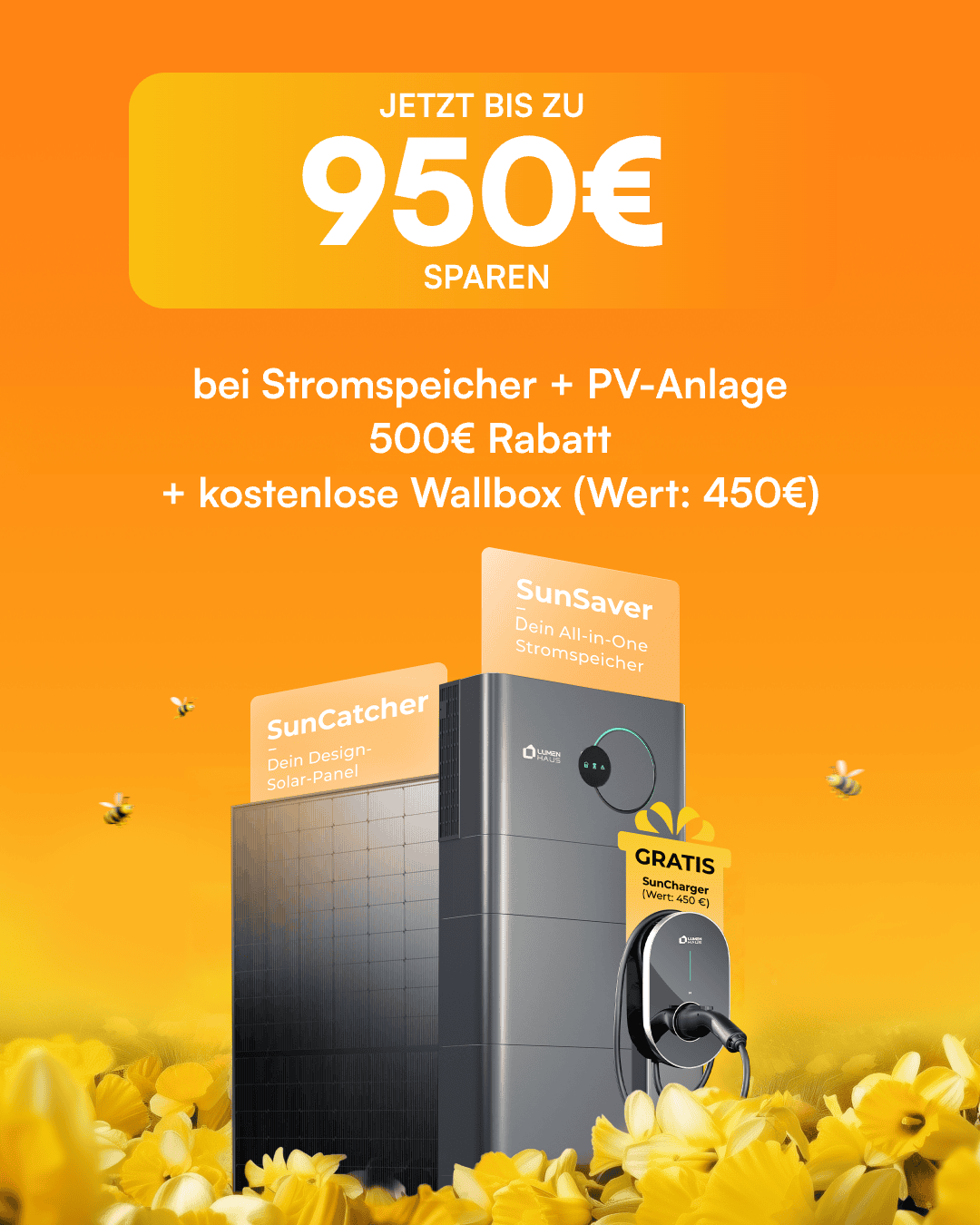 Bei Bestellung einer Photovoltaikanlage in Kombination mit einem Stromspeichersystem erhältst du eine kostenlose Wallbox sowie einen Preisnachlass, was einem Gesamtvorteil von 950 € entspricht.