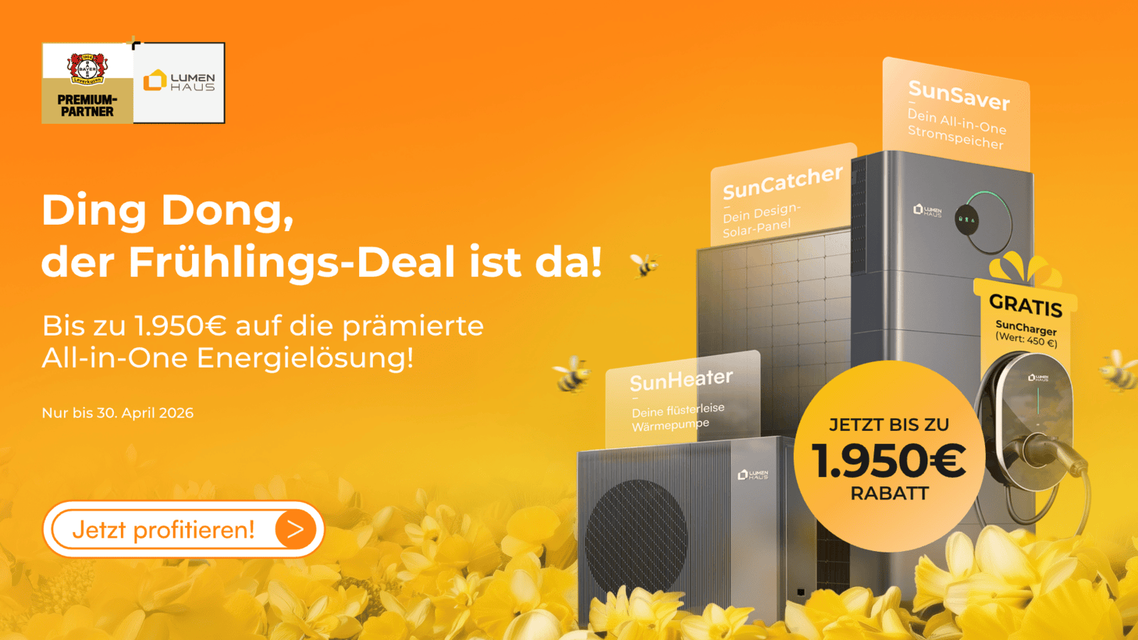 Um dieses Angebot in Anspruch nehmen zu können, musst du bis spätestens 30. April 2026 entweder ein Photovoltaiksystem mit Batteriespeicher oder ein reines Wärmepumpensystem bei uns bestellen.
